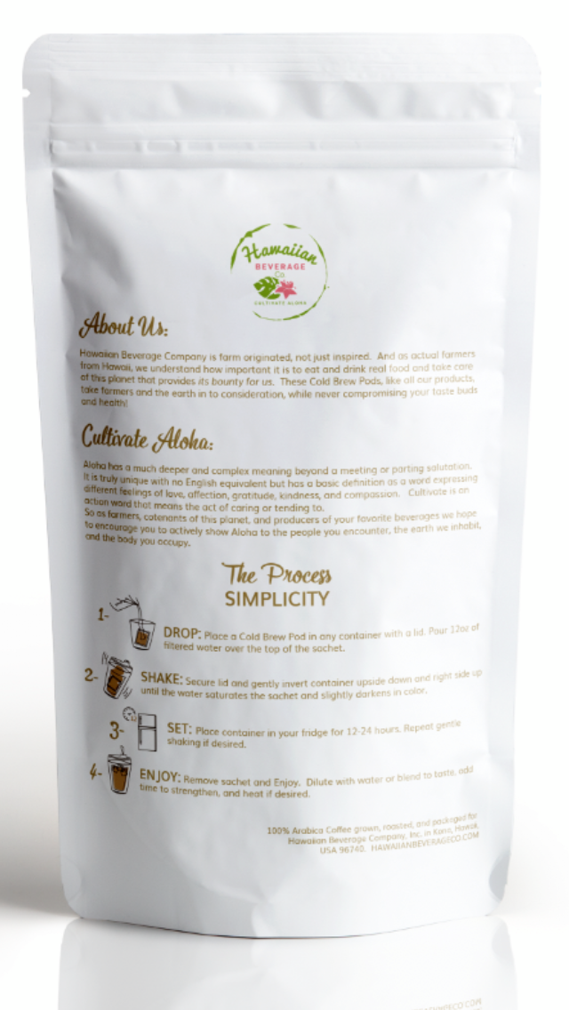 Discover the smooth, rich taste of Hawaii with our Big Island Cold Brew Pods. Each resealable mylar bag contains five large brew pods, carefully crafted to bring you a premium cold brew experience. Made from 100% Big Island-grown coffee, these pods deliver the unique, nuanced flavors that only Hawaiian coffee can offer.